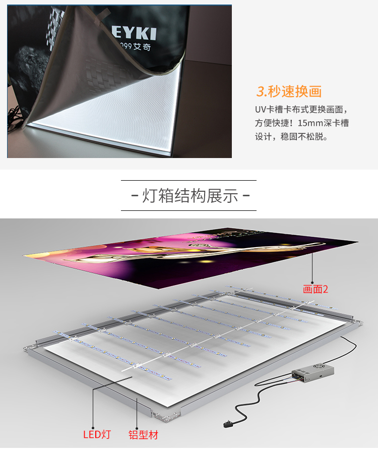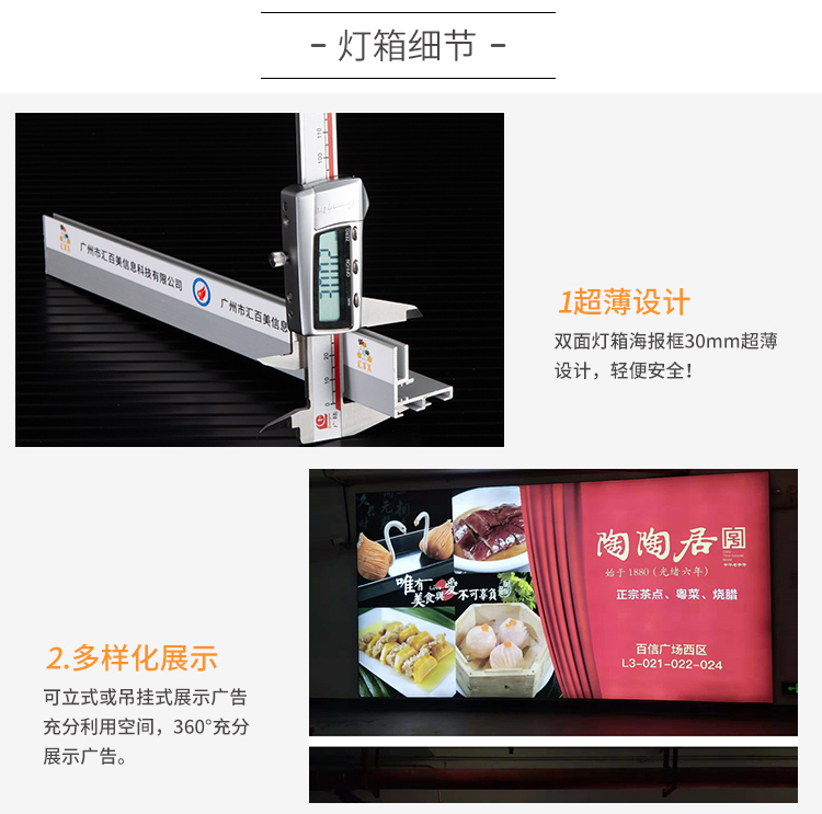 產(chǎn)品簡介:30mm超薄卡布燈箱,光源可選擇使用導(dǎo)光板,也可不打燈作廣告畫框使用,軟膜嵌入式換畫更方便,常用于掛墻式的廣告宣傳或裝潢裝飾,讓整個(gè)店鋪彰顯出高貴與奢華、高調(diào)與端莊。...