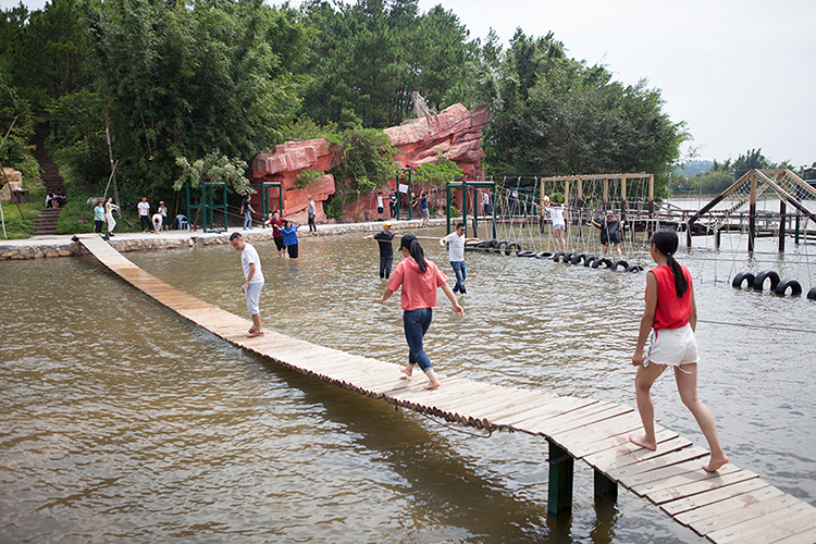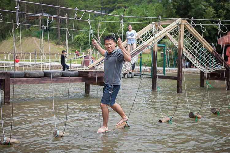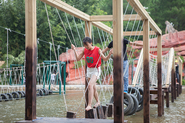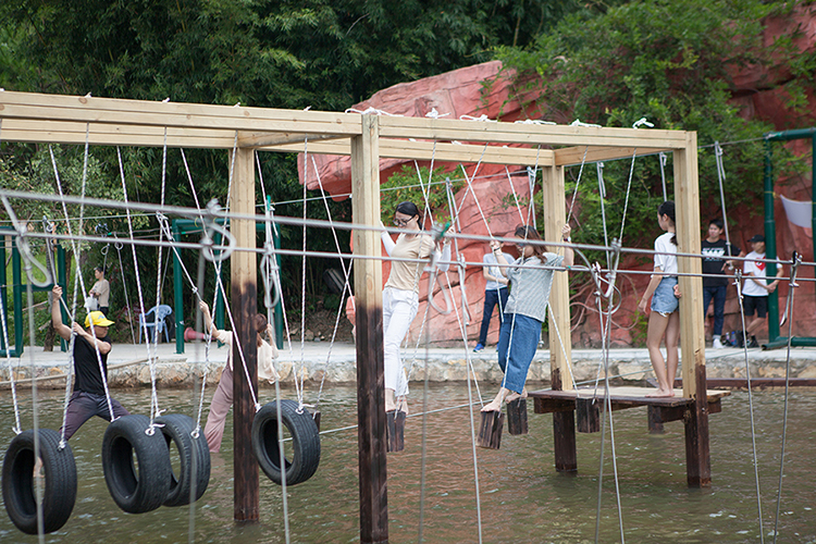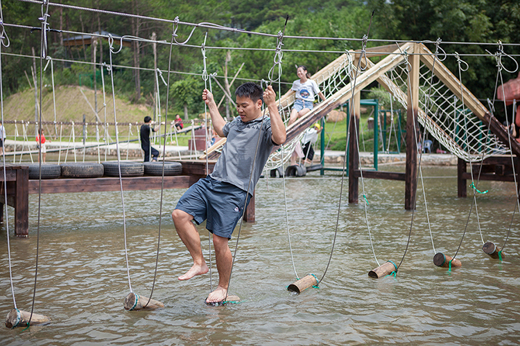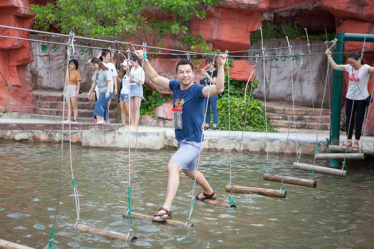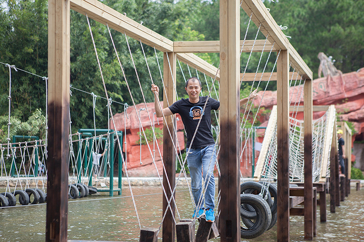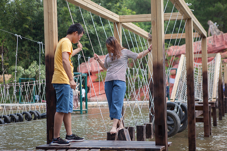 從玻璃橋下來,是一片水上項目拓展的地方,有不少好玩的挑戰(zhàn)項目!這里的項目都特別考驗人的手腳并用與身體平衡。