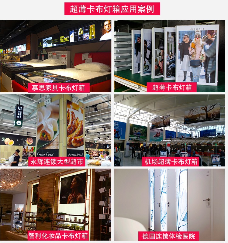 產品簡介:6分超薄卡布燈箱,采用升級款60mm卡布鋁型材,安裝更方便,采用漫反射LED燈搭配熱轉印畫面,將廣告畫面還原設計師最初的設計元素,讓消費者過目不忘,從而達到真實的宣傳目的。...