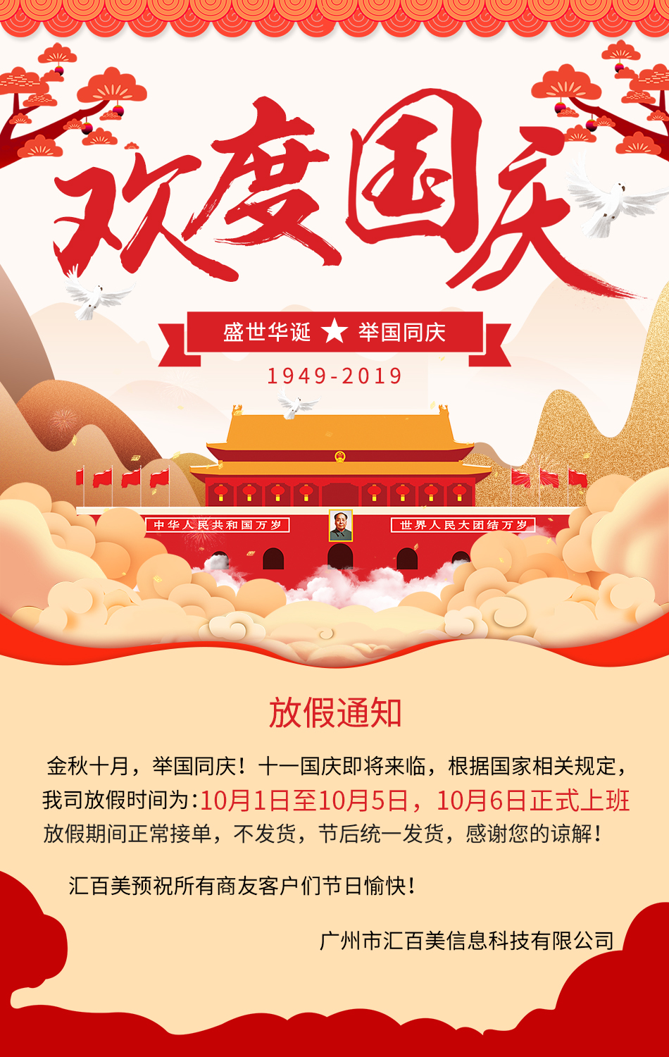歡度國慶!普天同慶!中國成立70周年!我們向祖國致敬!同時也祝愿我們的國家越來越強(qiáng),繁榮昌盛!也祝愿我們祖國母親永遠(yuǎn)平安!根據(jù)國家相關(guān)規(guī)定,我司放假安排如下: