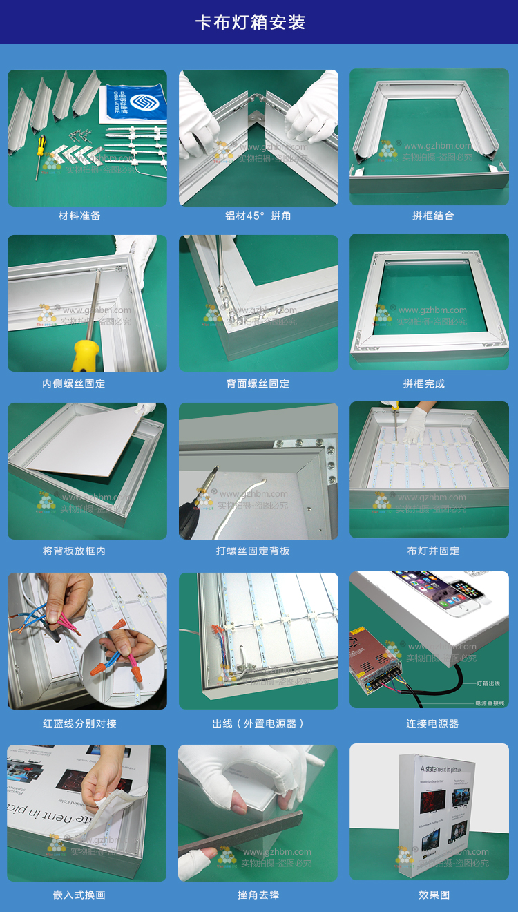 那么卡布燈箱的制作過程就如我上述所說,大家是不是覺得很簡單呢,其實(shí)也沒你們想的那么復(fù)雜了,如果還有不懂的,請(qǐng)看下面圖解,相信有圖有真相的面前,一目了然了吧~
