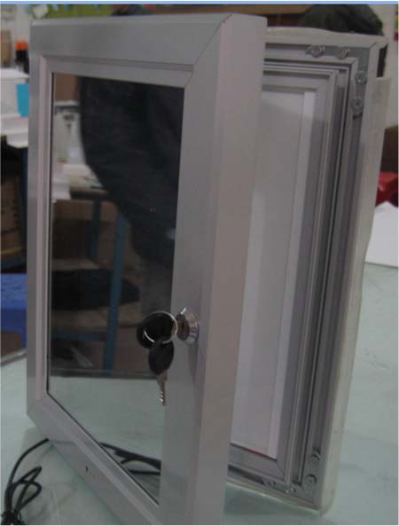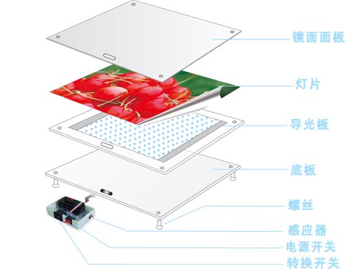 感應燈箱的制作跟水晶燈箱類似,主要區(qū)別是此款燈箱的面板采用的是半透鏡的面板,而且在燈箱內(nèi)安裝了一個感應器,所以感應燈箱的結構(如下圖)也有所不同感應器燈箱的主要性能是可以以兩種形態(tài)存在(人在時鏡子,人遠離時是廣告畫面).