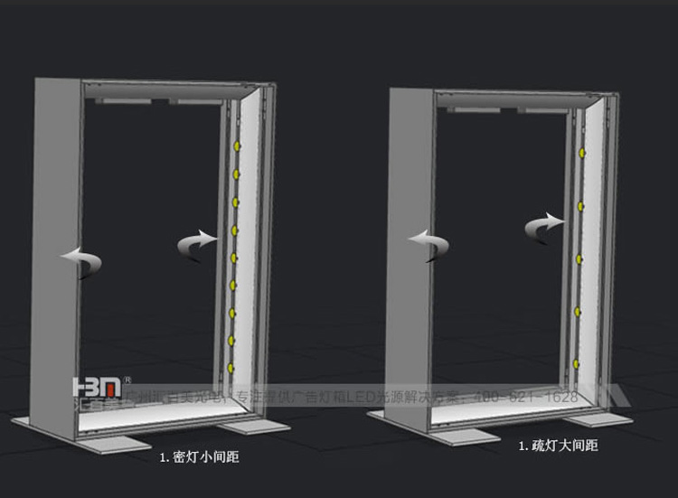 雙面燈箱一般多采用側(cè)光源,把燈條或是燈珠按一定的間距安裝在燈箱鋁材框四邊上就可以,能很好的把兩面燈箱畫面都受光均勻。不過受到燈箱面積影響,太大面積的燈箱一般不建議用側(cè)光源,怕光照不均勻,會(huì)影響宣傳效果。