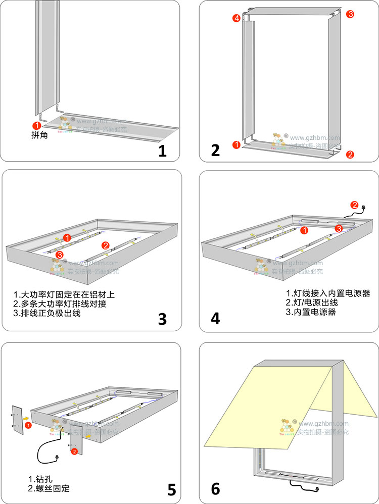 1:整齊、拼角——將切好45°角的鋁材4條、角碼螺絲若干、LED燈若干、底座等整齊,準備拼框