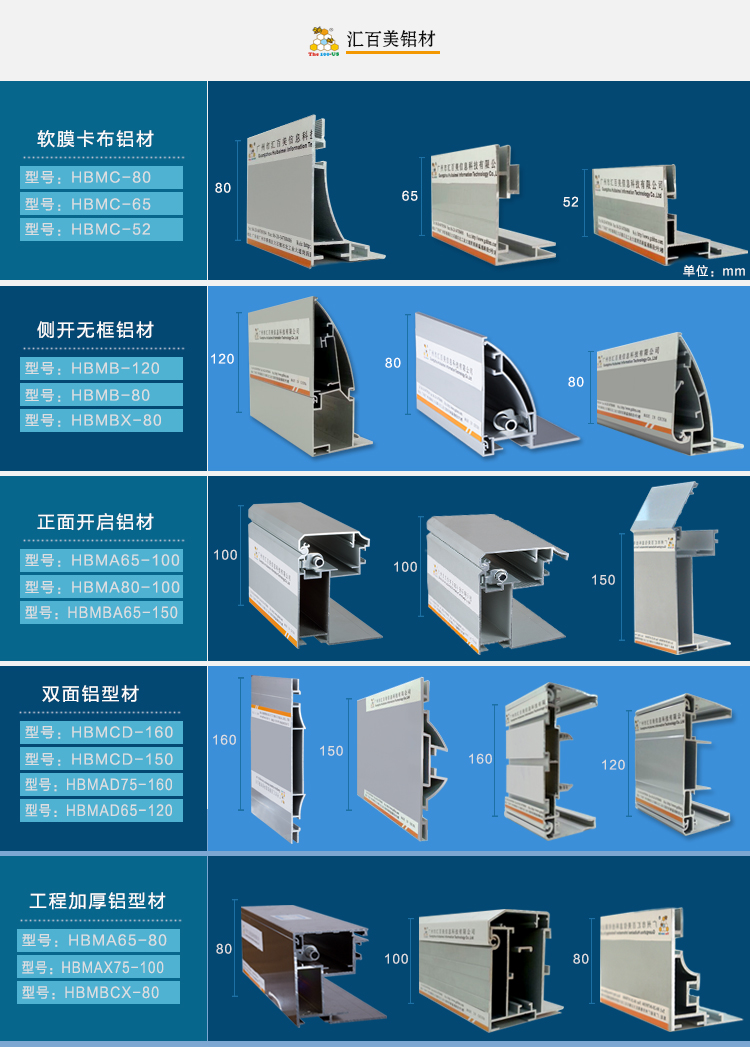 匯百美拉布型材主要產(chǎn)品有:正面開啟拉布鋁型材;側(cè)邊開啟式鋁型材;無框卡布鋁型材;另外無框卡布跟正面開啟式還可以細(xì)分為單面型的,雙面展示的類型,適合一大部分客戶的需求,廣泛用于地鐵、商業(yè)廣場(chǎng)、酒店、營(yíng)業(yè)廳等場(chǎng)所,雙面展示廣告,雙向獲益。正面開啟鋁型材加厚型,廣告畫面也是通過掛鉤扎帶式固定,使用的是無網(wǎng)刀刮布,這款燈箱更適合做大型廣告燈箱,比較牢固堅(jiān)實(shí),工程用料的鋁材更加厚實(shí),是專為高鐵、市政、機(jī)場(chǎng)等工程設(shè)計(jì)的;無框卡布鋁材是中國(guó)移動(dòng)、中國(guó)電信專用款鋁材,卡布鋁型材和側(cè)邊開啟是表面看起來都是無邊框的,使用軟膜卡布式安裝畫面,更快更方便!表面無框設(shè)計(jì),視覺無阻礙,廣告擴(kuò)大化!
