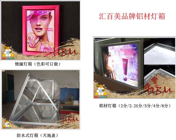 匯百美品牌LED鋁材燈箱按尺寸規(guī)范分有:2cm鋁材燈箱,2.25cm鋁材燈箱、3cm鋁材燈箱,4cm鋁材燈箱以及6cm鋁材燈箱5種,這個(gè)主要是根據(jù)型材的寬度來(lái)定義的,當(dāng)然,各種型材結(jié)構(gòu)也不一之處;也可以按按色彩分類分為鋁原色、黑色、以及七彩色3款,其中七彩色的燈箱也是我們常說(shuō)的艷麗燈箱,因?yàn)槿旧木窒扌?,只有?shù)量多時(shí)才可以定做這款LED燈箱,而且燈箱的邊長(zhǎng)不可以超過75cm;根據(jù)型材的質(zhì)地可以分為光面和啞面兩種,還有就是按使用性能進(jìn)行分類分為防水鋁材燈箱和普通燈箱和防水型鋁材燈箱。