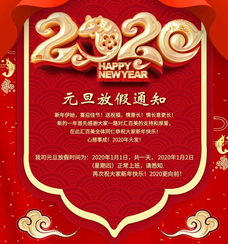 新年伊始,喜迎佳節(jié)!送祝福,情意長!情長意更長!新的一年首先再感謝大家一路對匯百美的支持和厚愛,在此匯百美全體同仁恭祝大家新年快樂!心想事成!2020年大發(fā)!