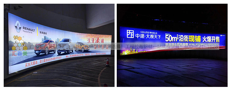 為了充分利用空間以及讓整個項目場景體現(xiàn)美和統(tǒng)一,停車場拐彎位常常被利用來安裝廣告載體,而這些位置安裝的燈箱形狀就不僅限于規(guī)則的四方形形狀,更多的是弧形、不規(guī)則圖形等異形形狀,但是制作這樣的弧形燈箱工序以及對鋁型材的質(zhì)量要求也非常高,若鋁材質(zhì)量不好,是經(jīng)不起這番“折騰”的。