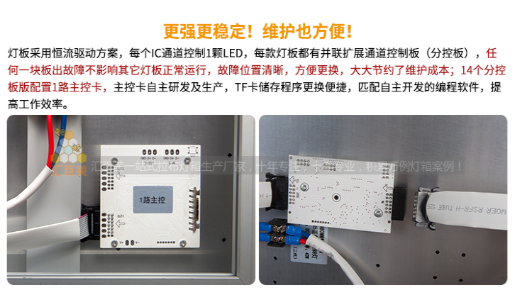 匯百美LED燈采用高精密IC控制器 ,一次性投入,長期收益!總體成本低,燈箱可重復使用,更換畫面時只需要通過芯片的TF卡插口重新輸入編程即可,方便快捷安全。也是眾多客戶選擇我們的原因!
